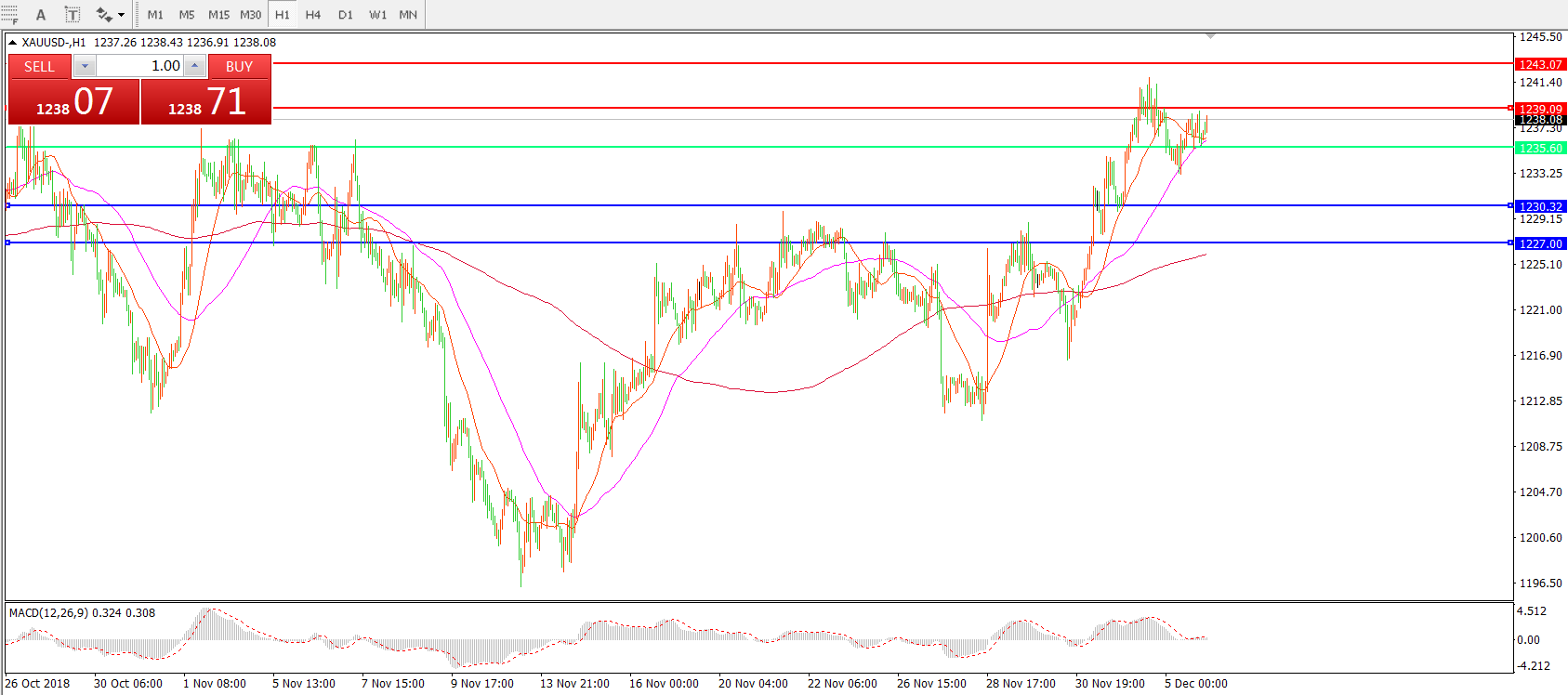 现货黄金XAUUSD 1小时图: