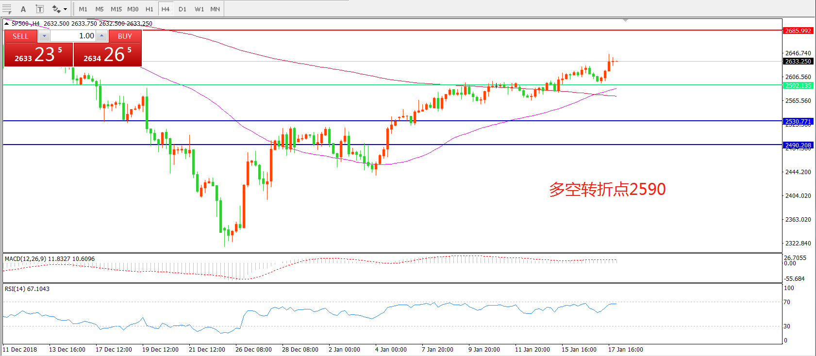 4小时图看,SP500近期逐渐站稳200周期均线,短期55均线有拐头上升迹象,MACD红柱缩短,小幅反弹成为可能。