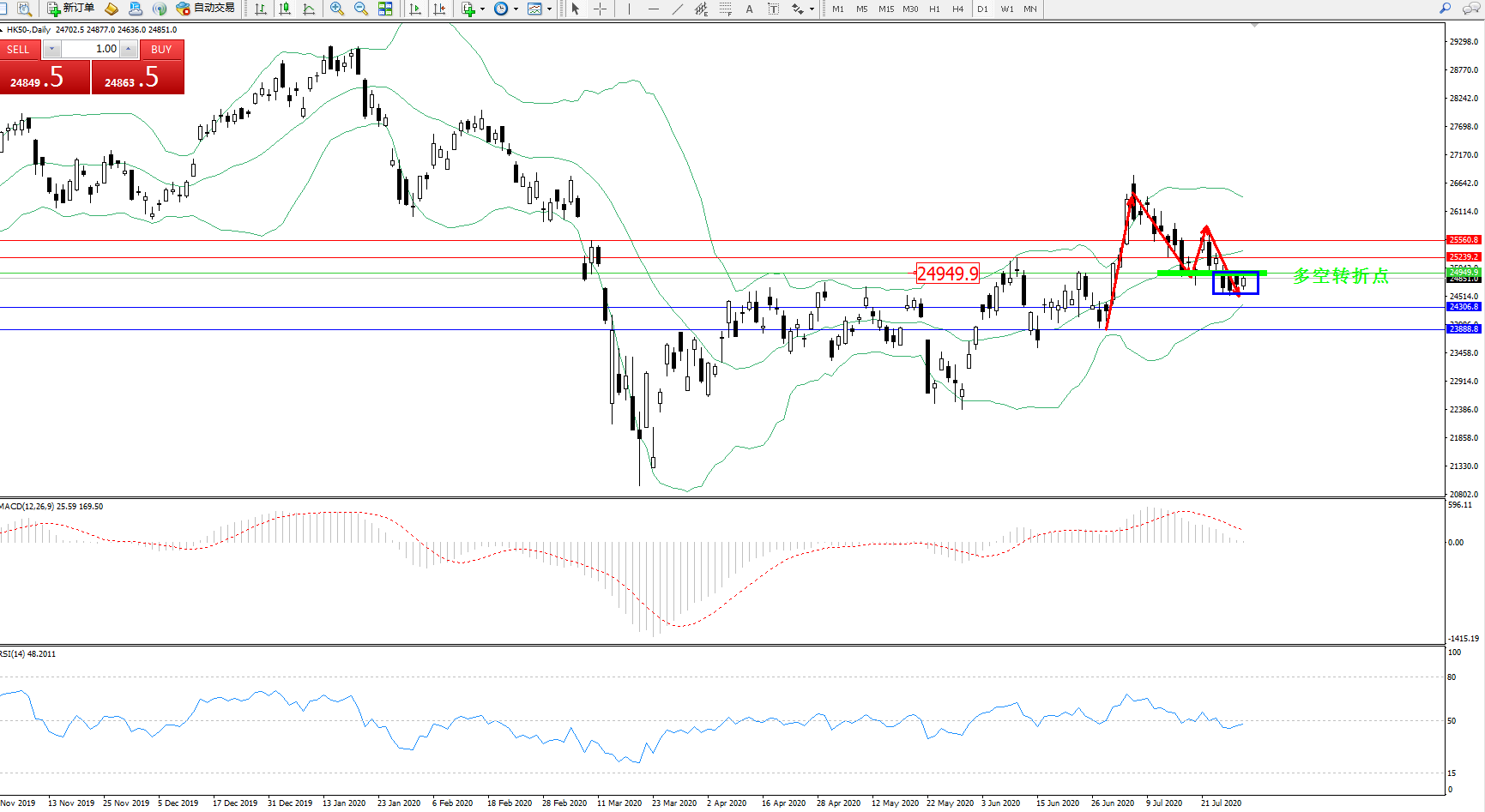 香港恒生指数7月29日(周三)收盘上涨110.38点,涨幅0.45%,报24883.14点;港股三大指数震荡收涨,半导体板块强势领涨,中芯国际大涨近9%;在线教育股跌幅较大,新东方在线下挫7.66%;香港疫情严峻,本地消费股普跌。恒指成份股中,吉利汽车、汇丰控股、恒基地产均升超2%,三桶油小幅收跌。今日南下资金净流入47.67亿港元,大市成交额为1044亿港元。香港政府统计处今日发布2020年第二季的本地生产总值预先估计数字。根据预先估计数字,2020年第二季本地生产总值较上年同期实质下跌9.0%,差过市场预期的8.2%,而2020年第一季的跌幅为9.1%。本地生产总值下跌主要是由于内部及对外需求均持续疲弱所致。