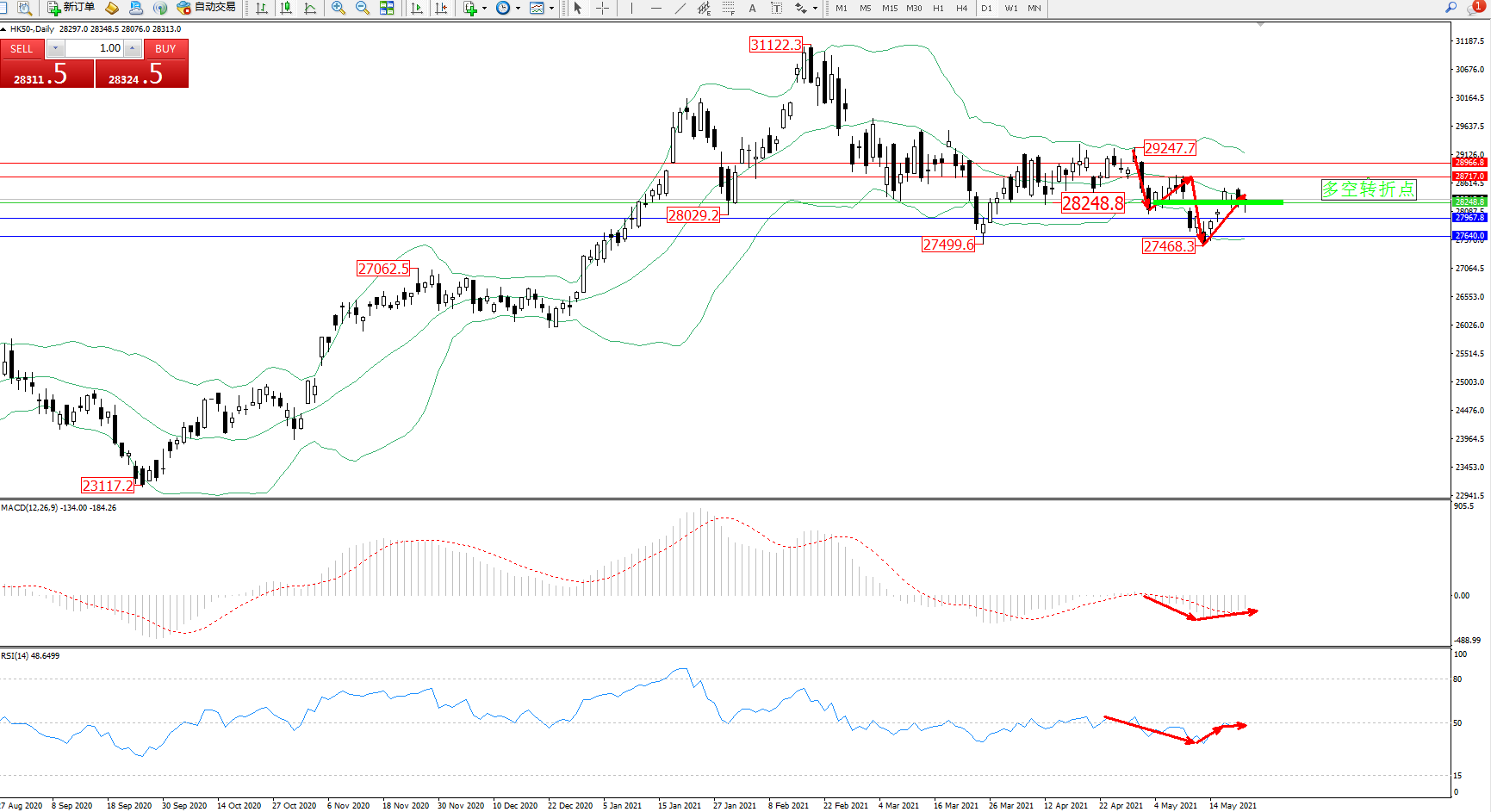技术点评:空头动力延续布林带指标通道中下轨区间呈阶梯式震荡下行,低位抵达27468位置后得到短暂支撑反转上移,多头动力处于中轨附近弱势窄幅震荡中,布林带指标呈张口走势后开始缓慢收口,MACD指标处于0轴线下方空头区域弱势整理徘徊,RSI指标处于空头区域维持50均衡线下方窄幅整理;