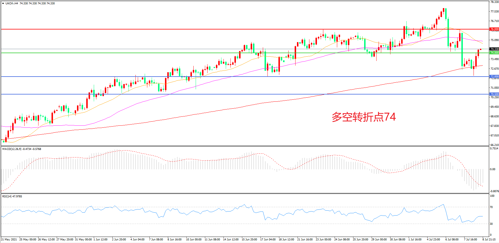 周四(7月8日),根据美国能源信息署公布的数据显示,当周EIA原油库存降幅超预期,市场信心受到提振,布伦特原油震荡反弹,收报74.33美元/桶。由于沙特和阿联酋罕见公开争吵导致谈判陷入僵局,油价一度快速回调,中期来看,OPEC+的政策选择仍是影响原油供需平衡表的重要因子,从短线看,布油震荡反弹的概率较大。