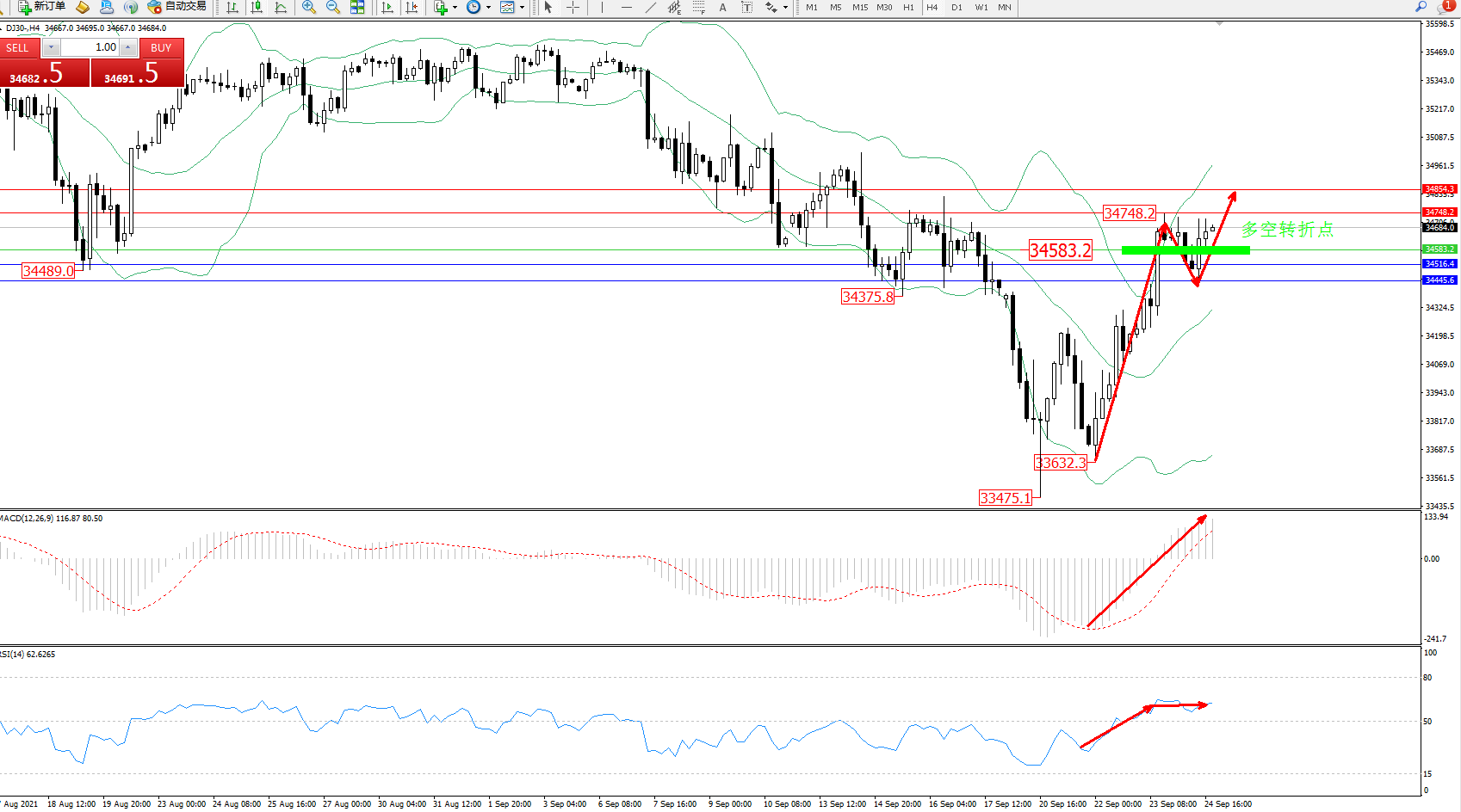 技术点评:多头动力延续布林带指标通道中上轨区间持续震荡上扬,高位抵达34748位置后开始短暂回撤,多头动力有继续向上移动态势,布林带指标呈张口走势持续中,MACD指标处于多头区域持续震荡向上移动,RSI指标处于50均衡线上方窄幅整理平移中;