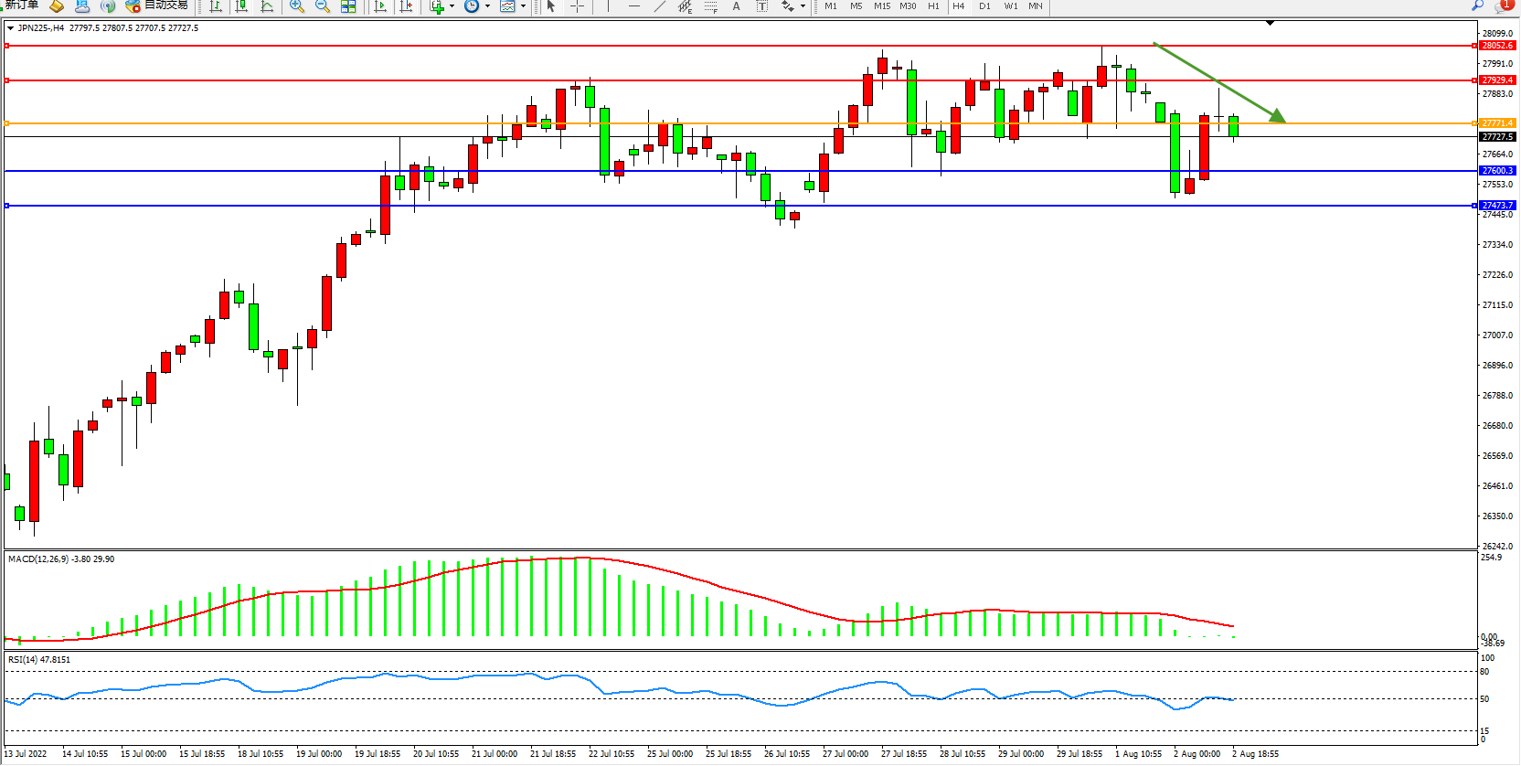 日经225指数8月2日(周二)收盘下跌403.85点,跌幅1.44%,报27589.50点。日本《朝日新闻》2日报道说,日本外务大臣林芳正当天在记者会上称,“日本政府无法发表评论”,但“中美关系的稳定对国际社会极为重要”。