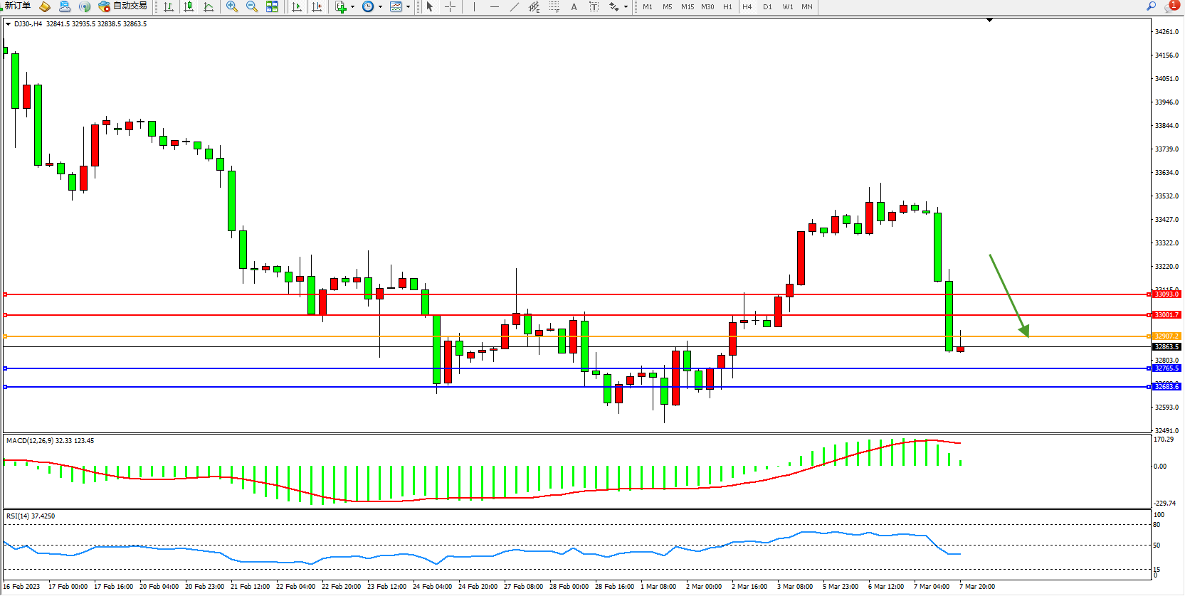 道琼斯指数3月7日(周二)收盘下跌574.58点,跌幅1.72%,报32856.86点;鲍威尔参议院证词放鹰,称如果有必要,美联储准备加快加息步伐,终端利率或将高于预期。