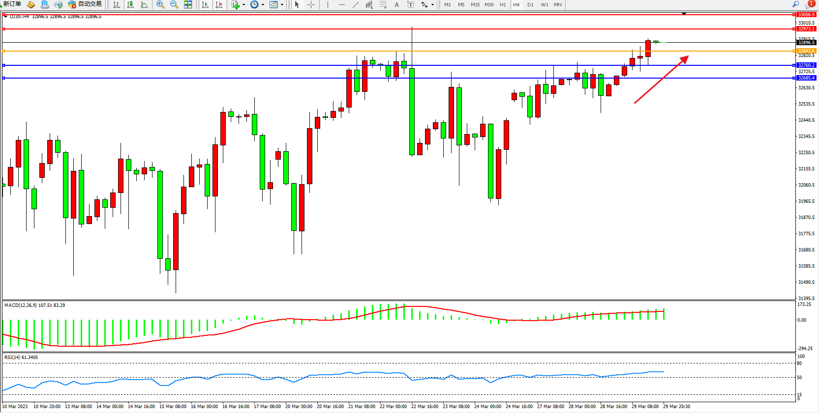 道琼斯指数3月29日(周三)收盘上涨323.71点,涨幅1.00%,报32717.96点;货币市场报价目前显示,美国联邦基金利率目标区间今年年底将在4.25-4.50%,比当前水平低50个基点;如果美国通胀被证明具有粘性,对美国利率持鸽派预期人士失望的可能性会更高。