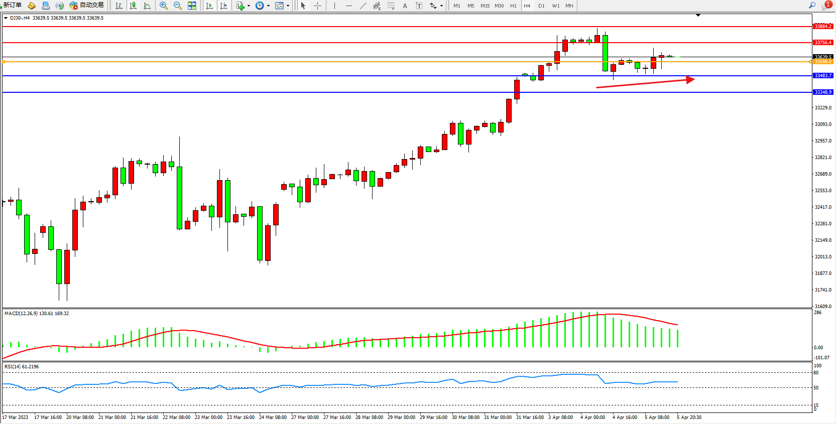 4小时图看:高位短期弱势整理,市场整体多头动力开始减弱,但依旧处于高位徘徊中,MACD指标处于多头区域缓慢下移,RSI指标处于50均衡线上側弱势徘徊;