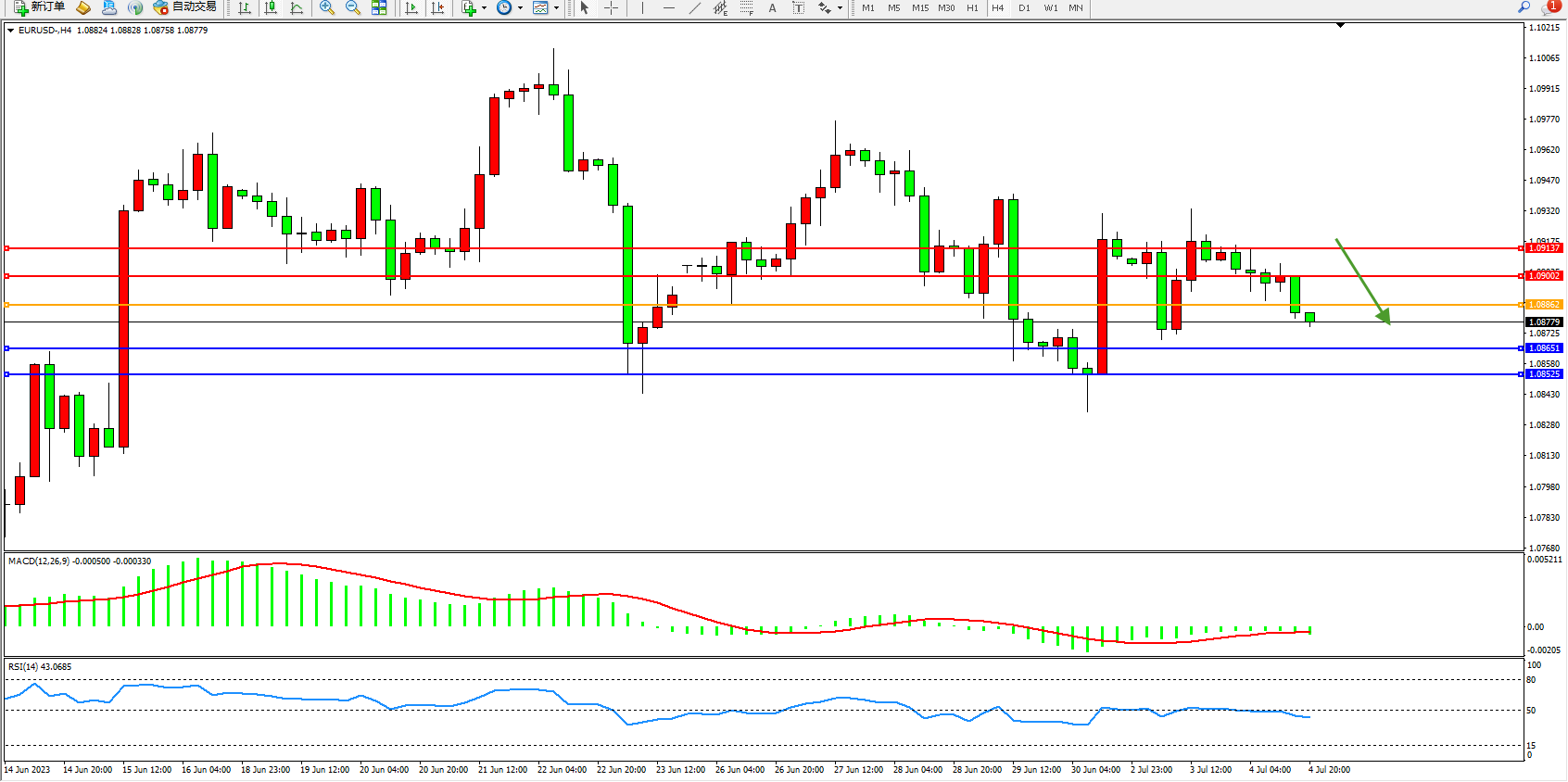 4小时图看:空头动力维持震荡持续下行,短期跌势或将延续,市场整体不断向下移动中,MACD指标处于0轴线下侧弱势徘徊,RSI指标处于50均衡线下侧弱势整理;